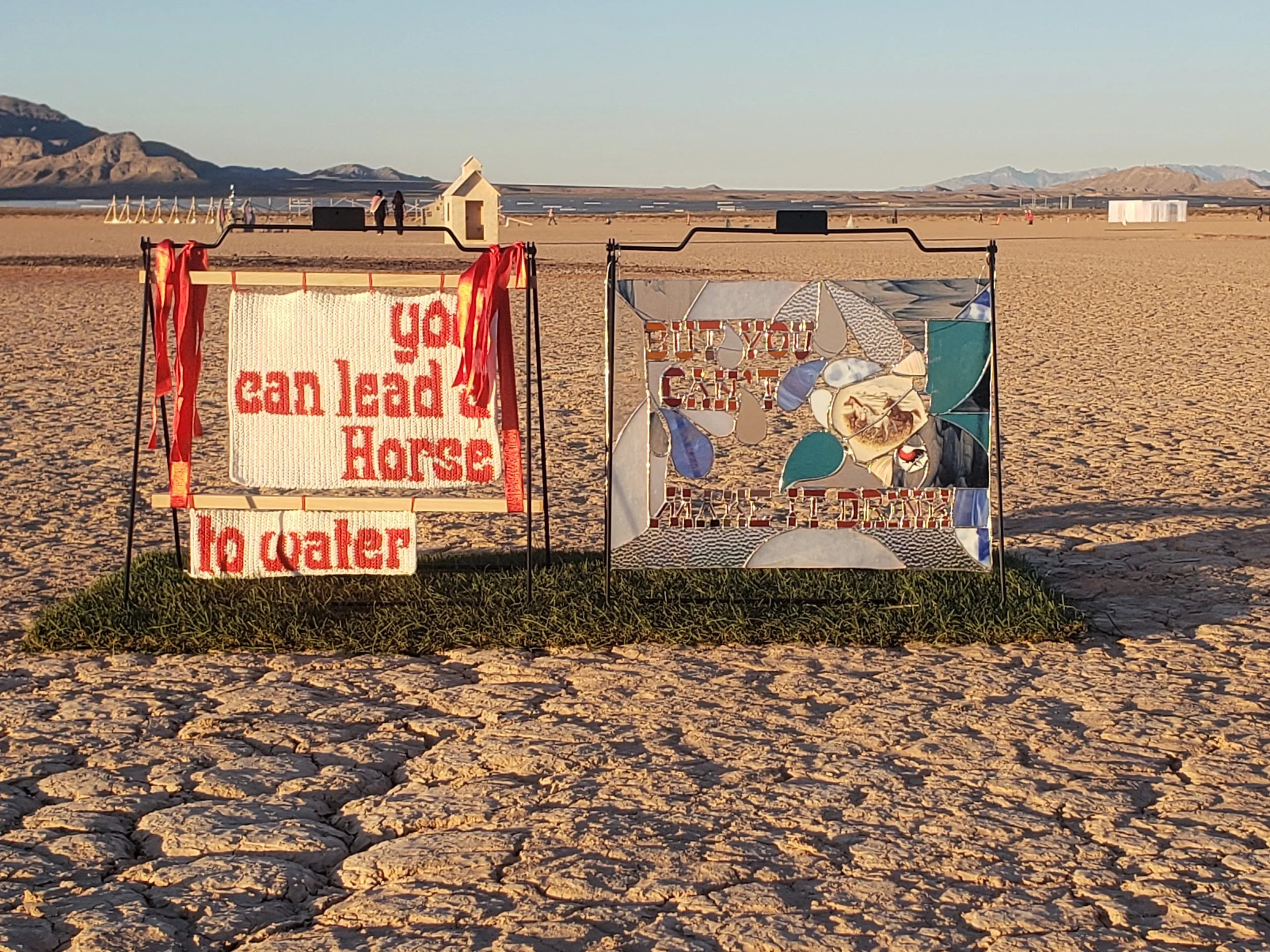 You can lead a horse to water, but you can't make it drink (2025) by Camryn Maher and David Delfin is the duo's first collaborative piece. Presented as a diptych, the two sculptures draw upon each artist's primary medium and individual practice, coming together to create a single work interfacing with usage debate over Nevada public lands and expressive social politics. Created specifically for the Desert Biennial Project, the work responds to the event's theme of gravity through the use of "A-frame" yard signs and its engagement with the site—public lands at the Apex dry lakebed.