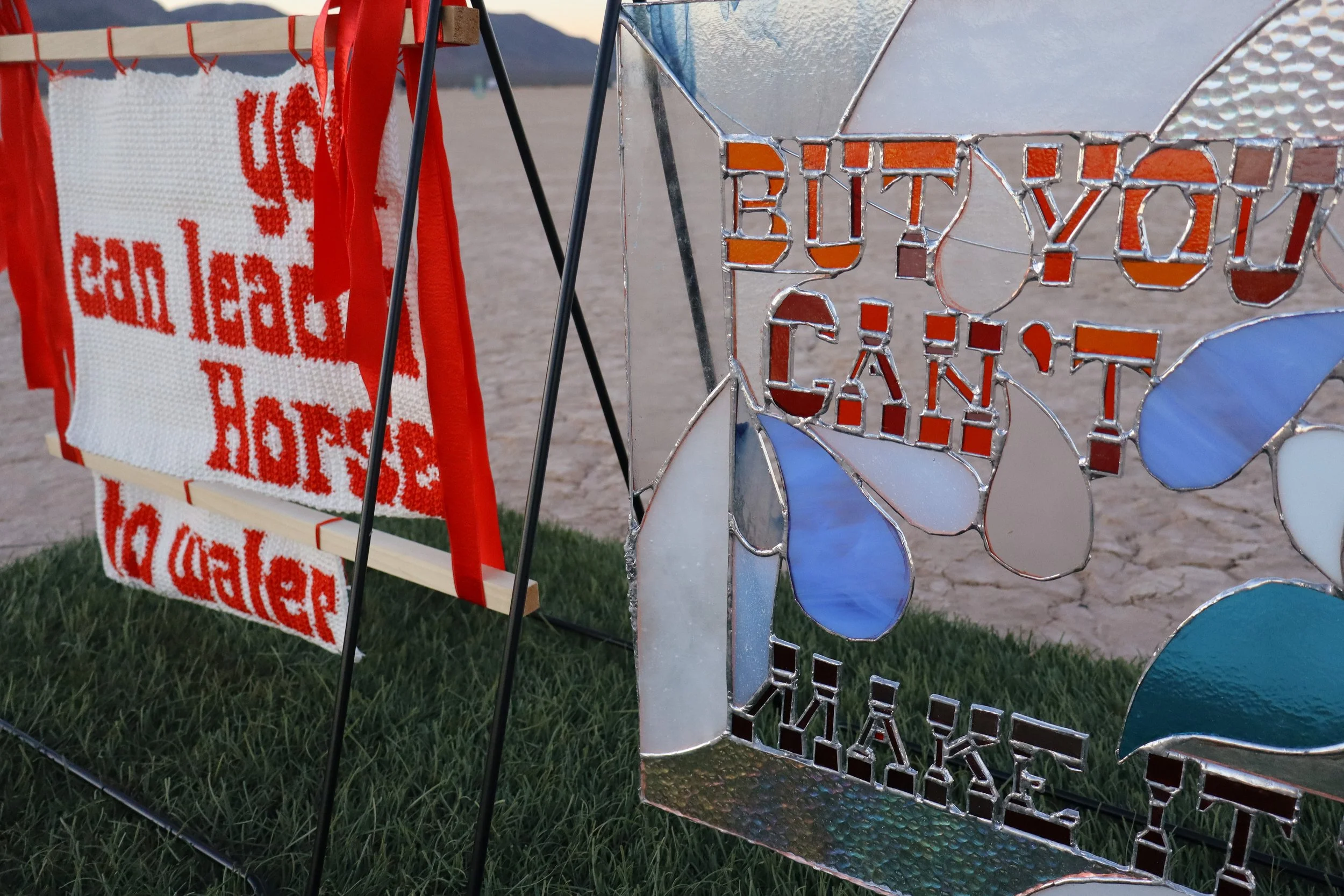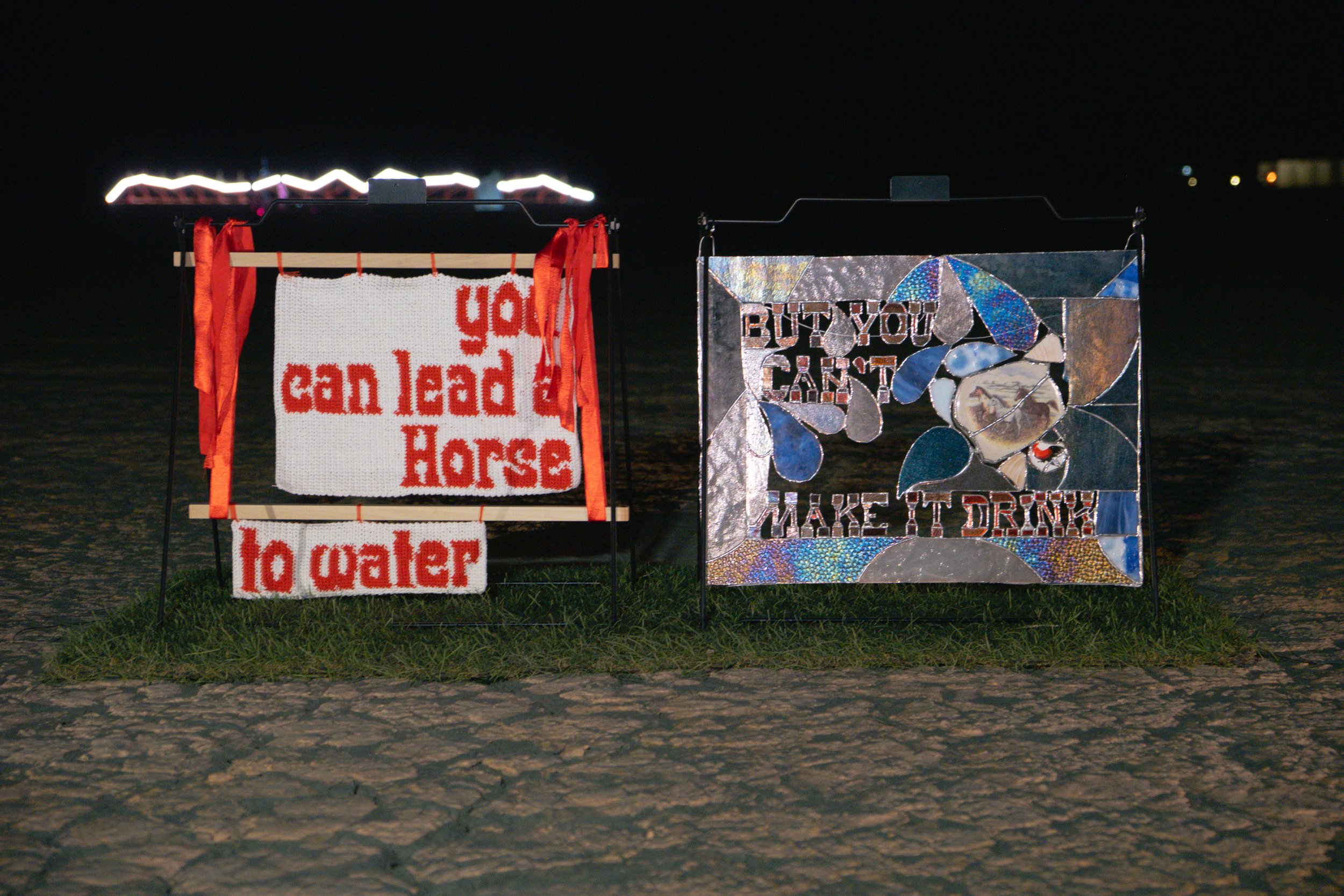 you can lead a horse to water, but you can’t make it drinkYarn, ribbon, glass, ceramics, A-frame sign, astroturf, solar yard lights